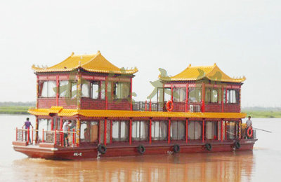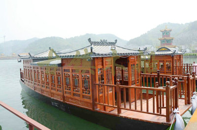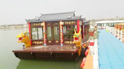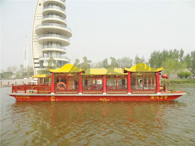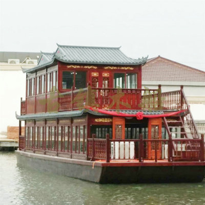 畫(huà)舫船就是裝飾古典華麗的游船,是"中國(guó)風(fēng)"的仿古游船,結(jié)合古典園林建筑,體現(xiàn)了中華文明的古典藝術(shù).畫(huà)舫船豪華而又古典,船上的建筑按照中國(guó)古代建筑里的亭臺(tái)樓閣,建筑工藝之復(fù)雜,要求之嚴(yán)格,仿古畫(huà)舫游船的特點(diǎn)飛檐翹角、玲瓏精致的四角亭子逐漸成形,赫然立于船頭,美人靠、盤(pán)龍柱子、彩畫(huà)……龍柱上的浮雕盤(pán)龍和祥云一層扣著一層,層層錯(cuò)落有致,雕刻精細(xì)到盤(pán)龍身上的每一個(gè)鱗片都細(xì)細(xì)可數(shù),古代皇家標(biāo)志性元素,在畫(huà)舫船上體現(xiàn)的淋漓盡致。除了雕刻、花窗,整條船還有一個(gè)看點(diǎn),那就是弧線(xiàn)優(yōu)美、高高翹起的船尾。游船并不大,長(zhǎng)約10米、寬3米,但是整體看起來(lái)堪稱(chēng)一件藝術(shù)品。船尾的雕花欄桿與船艙、船頭的雕刻遙相呼應(yīng),船身四周貼著浮雕祥云,給整條船增添了富貴、華麗的氣質(zhì)。